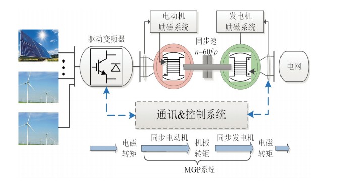 黃永章:目前新能源并網(wǎng)方法最大的技術(shù)問題就是它們是電流源,而非電壓源。新能源同步機(jī)這個(gè)方案的出發(fā)點(diǎn)是,同步發(fā)電機(jī)是傳統(tǒng)交流電力系統(tǒng)的基礎(chǔ),而且已經(jīng)被證明了非常有效。于是我們就提出,既然同步機(jī)這么好,為什么不把同步機(jī)保留下來,而一定要替換掉呢?如果可以保留,應(yīng)該怎么保留?答案就是用新能源驅(qū)動(dòng)一個(gè)同步電動(dòng)機(jī),再用同步電動(dòng)機(jī)帶動(dòng)同步發(fā)電機(jī)發(fā)電并網(wǎng),這樣就把新能源電力轉(zhuǎn)變成了一個(gè)交流電網(wǎng)需要的電壓源。我們把這個(gè)裝置稱為同步電機(jī)對(duì)并網(wǎng)(MGP),隨著研究的逐步深入,我們又把這個(gè)方案叫作新能源同步機(jī)