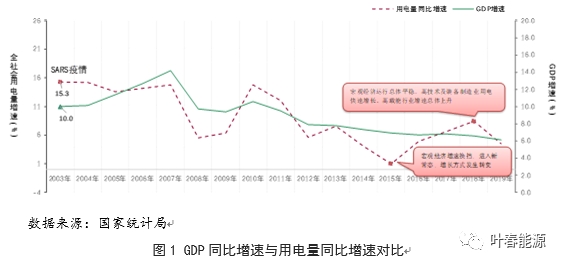 用電量與GDP增速具有較強(qiáng)的相關(guān)性。從GDP與用電量增速對(duì)比曲線圖可以看出,2003-2019年二者用電量走勢(shì)基本一致。2015年和2018年二者有些背離,一方面是經(jīng)濟(jì)增速進(jìn)入換擋期,動(dòng)力轉(zhuǎn)換;另一方面是二者統(tǒng)計(jì)指標(biāo)調(diào)整時(shí)間上有些不一致。