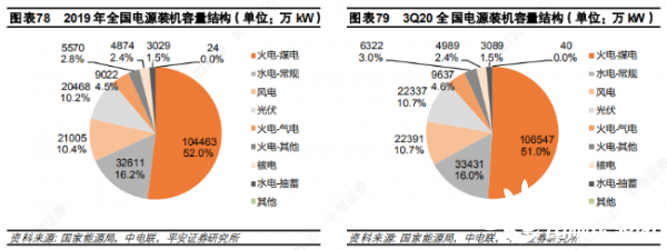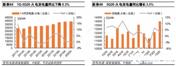2019/2020 年冬季(2019 年 12 月及 2020 年1月、2月),全國(guó)平均氣溫較常年同期偏高1.1℃,是 1961年以來歷史同期第五高。暖冬疊加疫情,雖然有春節(jié)淡季因素存在,發(fā)、用電量仍下降超過5%,Q1火電發(fā)電量下降 8.2%,全行業(yè)上市公司營(yíng)收下降 9.9%。隨著新冠疫情迅速得到有效控制,全社會(huì)用電需求顯著回暖,同時(shí)上半年水電出力不足,火電發(fā)電量在 Q2同比增長(zhǎng) 6.5%。但 Q3水電大發(fā),火電同比增速回落至 3.3%。