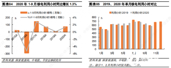 直至9月,年內(nèi)第一臺(tái)新投產(chǎn)機(jī)組田灣 5 號(hào)才實(shí)現(xiàn)商運(yùn)。全國(guó)核電運(yùn)行狀況持續(xù)向好,利用小時(shí)節(jié)節(jié)攀升,前三季度累計(jì)利用小時(shí)連續(xù)第四年實(shí)現(xiàn)增長(zhǎng)。觀察單月的利用小時(shí)情況,除了 7、8、10三個(gè)月受創(chuàng)紀(jì)錄來水帶來的水電強(qiáng)勢(shì)壓制外,僅有 1、2 月受疫情影響導(dǎo)致利用小時(shí)低于上年同期。但從下降幅度來看,1-2月水、火、風(fēng)利用小時(shí)降幅均超過 10%,而核電同比下降不到 7%,穩(wěn)健性凸顯無疑。