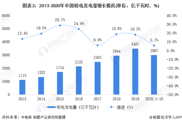 雖然近年來受國家核電批復(fù)減少以及新建投資額的降低的影響,我國核電主要企業(yè)電源項目在建規(guī)模有所縮小,但是隨著項目的完工,我國核電裝機規(guī)模不斷擴大,發(fā)電量同步提高。根據(jù)中國電力企業(yè)聯(lián)合會的數(shù)據(jù)顯示,2020年1-10月,全國核電發(fā)電量2987億千瓦時,同比增長5.7%,增速比上年同期回落13.6個百分點。