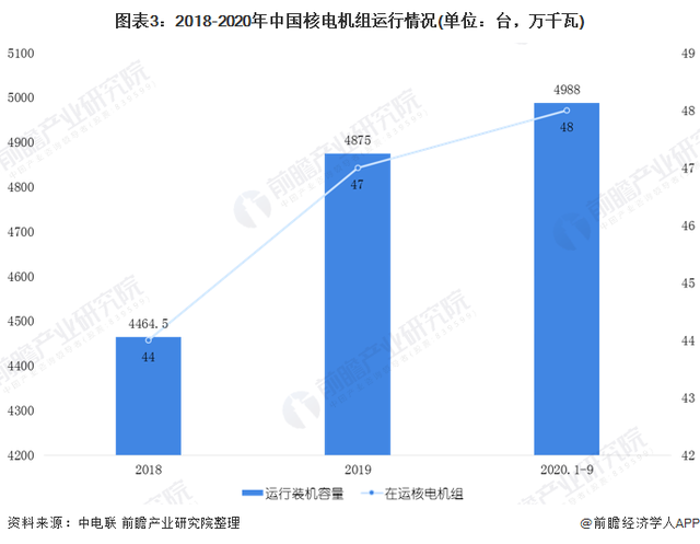 截至2019年底,中國在運核電機組共47臺,分別位于8個沿海省份的13個核電基地中,運行裝機容量達(dá)到4875萬千瓦,位居世界第三,占全國總裝機容量的2.5%左右。截止2020年9月底,中國在運核電機組48臺,總裝機容量4988萬千瓦。