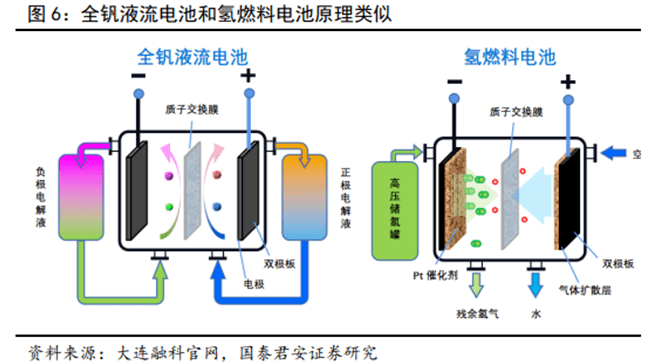全釩液流電池與氫燃料電池結(jié)構(gòu)與原理類似,電堆是系統(tǒng)的核心部件,是發(fā)生電化學(xué)反應(yīng)和產(chǎn)生電能的場(chǎng)所,電解液或氫氣儲(chǔ)存在外部?jī)?chǔ)罐中。