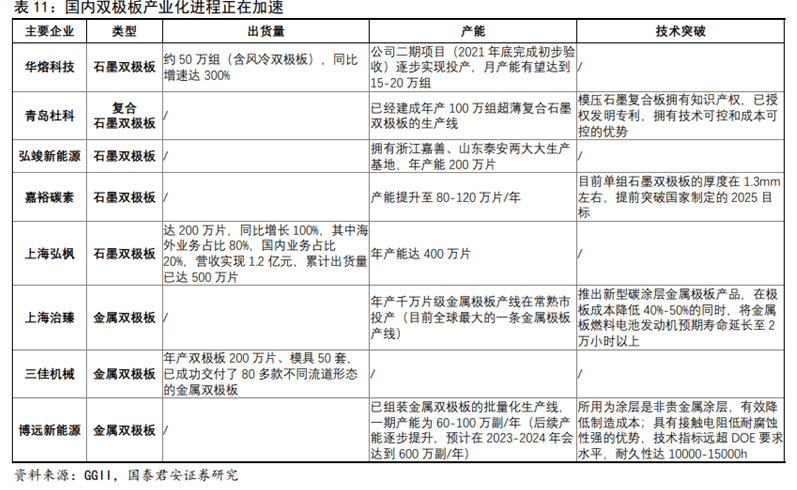 國內(nèi)產(chǎn)業(yè)化進程正在加速:據(jù)GGII統(tǒng)計,2021年期間,國內(nèi)主流雙極板企業(yè)出貨量增長顯著,金屬雙極板領(lǐng)域已出現(xiàn)單個企業(yè)單個客戶出貨達百萬片級別的現(xiàn)象;石墨板市場各家出貨也均有較大增長,表現(xiàn)明顯的是原萬片級出貨企業(yè)的出貨量級達到10萬片以上,頭部企業(yè)的出貨更是達到了50萬片/年以上。