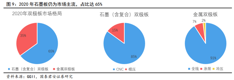 市場格局:仍以石墨板為主,金屬板或后來居上。氫燃料電池方面,2020年我國氫燃料電池雙極板市場規(guī)模達3.1億元,石墨板(包含碳塑復(fù)合板)和金屬板的市場占比分別為65%和35%,2021年石墨雙極板與金屬雙極板趨于平分秋色。GGII數(shù)據(jù)顯示,2021年H1金屬雙極板出貨量在雙極板總出貨量的占比已達45.0%(2020年同期為36.0%)。釩液流電池方面,基本不考慮金屬板,即使是涂層處理后的金屬板,在酸性液體環(huán)境中也難以長期穩(wěn)定工作。石墨雙極板(機加工)不被看好,因為其機加工過程復(fù)雜且成本高。釩液流電池主要采用碳塑復(fù)合板,因為其熱塑或模壓工藝相對機加工簡單,但是混合高分子樹脂所帶來的電阻率增加仍是需要解決的問題。