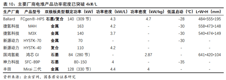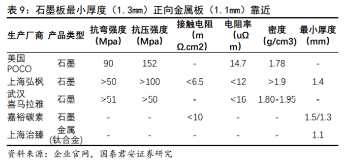 石墨板適應(yīng)需求趨于薄型化,乘用車為金屬板帶來機遇。石墨板:由于其高耐腐蝕性、高耐久性,以及相對較低的技術(shù)壁壘,率先實現(xiàn)國產(chǎn)化,在對體積較不敏感而對耐久性敏感的特種車、商用車領(lǐng)域示范應(yīng)用。然而,石墨雙極板的制作周期長、機械性能差、加工難度大、制作成本高等劣勢也不可忽視。市場已有越來越多的企業(yè)成功開發(fā)出超薄超精細石墨雙極板,提前突破了國家制定2025年前單組石墨雙極板厚度1.5mm的要求,功率密度開始接近豐田第一代金屬雙極板的水平。金屬板:抗腐蝕性差,壽命過短是其應(yīng)用的阻礙,然而隨著涂層工藝的持續(xù)進步與突破,其有望實現(xiàn)和石墨板相同的使用壽命。豐田汽車公司率先在旗下Mirai燃料電池汽車上使用金屬雙極板和涂層,解決了腐蝕、成本和導(dǎo)電等一系列問題。憑借其機械性能優(yōu)異、高體積功率密度、成本低廉且易批量生產(chǎn)等優(yōu)勢,金屬雙極板將在乘用車規(guī)模化應(yīng)用的進程中實現(xiàn)突破。