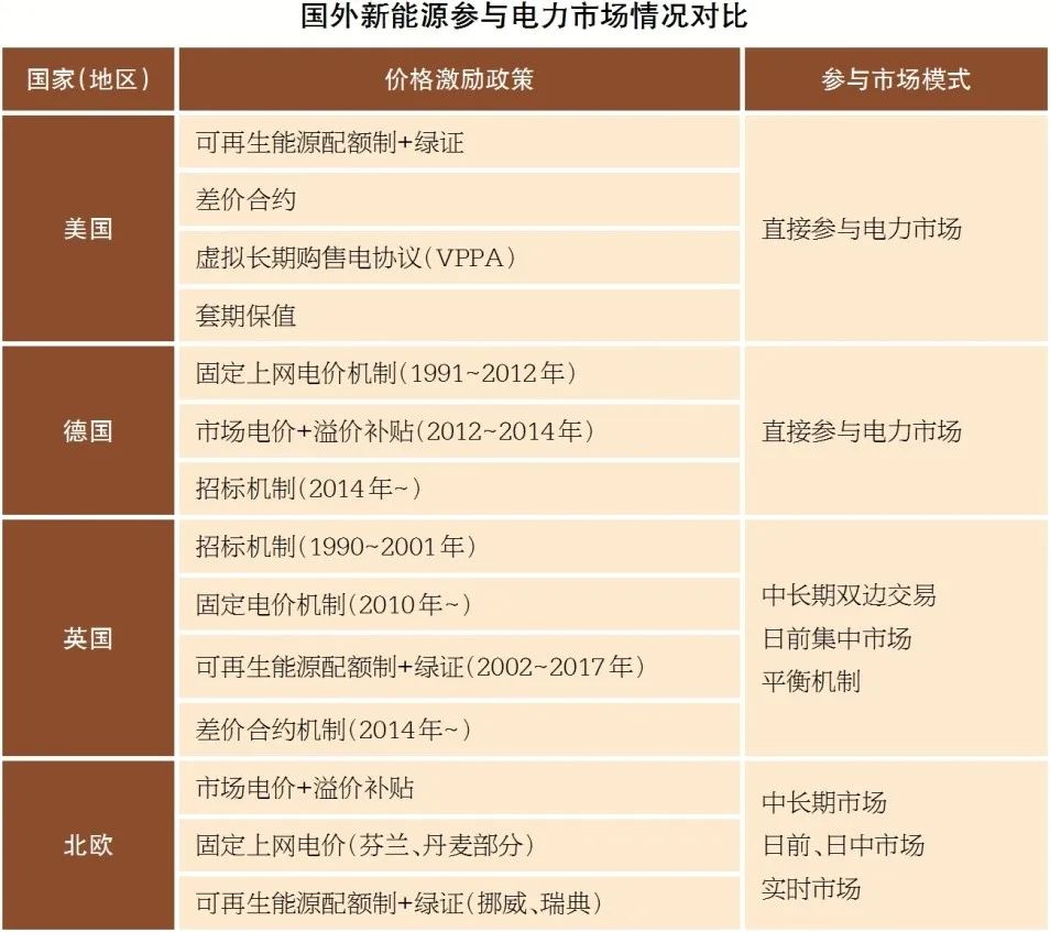 從全世界范圍來看,在新能源發(fā)展初期,許多國家通過固定上網電價機制、溢價補貼機制、“可再生能源配額制+綠證”、差價合約等政策機制鼓勵新能源產業(yè)發(fā)展,基本是以保障性消納為主,市場化機制為輔,不斷提升新能源在電力市場中的競爭力。隨著新能源快速發(fā)展、競爭力不斷提升,政府逐漸減少補貼,推動其平價甚至低價上網。此外,國外還在完善電量偏差處理機制、調峰調頻及輔助服務機制,推動新能源在更大市場范圍內消納等方面進行了很多探索和實踐,積累了很多寶貴經驗,對我國具有很強的借鑒意義。
