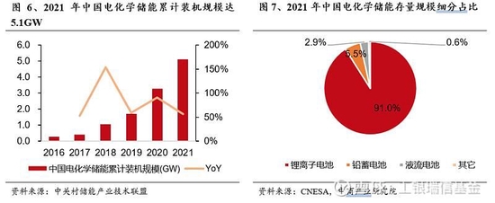 我國電化學(xué)儲能裝機(jī)規(guī)模持續(xù)高速增長,其中鋰電池儲能規(guī)模占比超九成。2021年,中國電化學(xué)儲能累計(jì)裝機(jī)規(guī)模5.1GW,同比增長56.5%,2016-2021年CAGR高達(dá)79.3%。其中,鋰離子電池儲能技術(shù)裝機(jī)規(guī)模4.7GW,裝機(jī)規(guī)模占比91.0%;鉛蓄電池儲能裝機(jī)規(guī)模0.3GW,占比5.5%;液流電池儲能技術(shù)裝機(jī)規(guī)模0.1GW,占比2.9%。