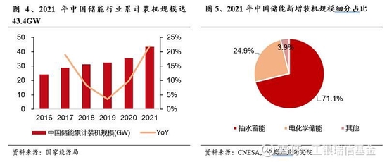 我國儲能市場穩(wěn)步擴(kuò)容,電化學(xué)儲能份額增長明顯。在新能源發(fā)電規(guī)模大幅增長的推動下,我國儲能裝機(jī)規(guī)模一直保持高速增長的趨勢。根據(jù)國家能源局?jǐn)?shù)據(jù),2021年中國儲能市場累計(jì)裝機(jī)功率位居全球第一,為43.4GW,同比增長21.9%,2016-2021年儲能累計(jì)裝機(jī)量年均復(fù)合增長率為12.3%。2021年我國抽水蓄能新增裝機(jī)5.2GW,占比71.1%;電化學(xué)儲能新增裝機(jī)1.8GW,占比24.9%,較2020年占比9.2%增幅較大,電化學(xué)儲能市場份額增長明顯。