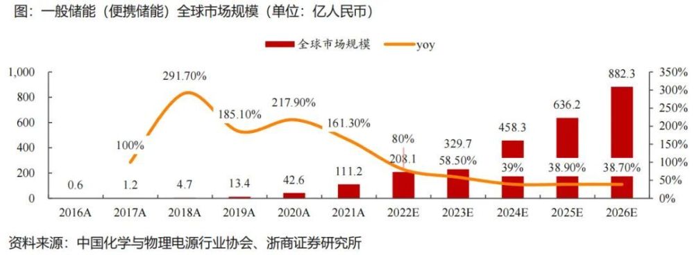 一般儲(chǔ)能/便攜儲(chǔ)能:適用于①戶外旅行場景,為手機(jī)/電腦等供電,滿足戶外旅行多樣化便攜需求;②應(yīng)急備災(zāi)等場景,在地震、海嘯多發(fā)地區(qū),可與太陽能電板構(gòu)成小型發(fā)電系統(tǒng),滿足災(zāi)民用電需求。根據(jù)中國化學(xué)與物理電源行業(yè)協(xié)會(huì)數(shù)據(jù),預(yù)計(jì)至2026年市場規(guī)模有望達(dá)882億人民幣。具體如下圖所示: