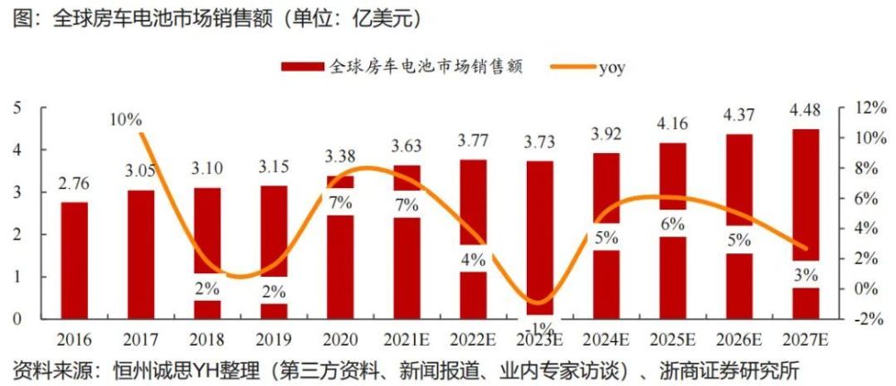 房車儲(chǔ)能:鉛酸電池儲(chǔ)能系統(tǒng)相對成熟,已被成品房車大量使用;近幾年趨勢會(huì)加配折疊太陽能電池板,備用發(fā)電。根據(jù)恒州誠思數(shù)據(jù),預(yù)計(jì)2026年房車用電池市場銷售額4.37億美元;伴隨儲(chǔ)能系統(tǒng)迭代升級(jí),房車儲(chǔ)能有較大機(jī)會(huì)。具體如下圖所示: