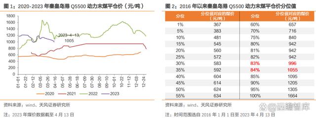 近期煤價持續(xù)回落,但仍處于歷史較高分位。2023 年 4 月 13 日秦皇島 Q5500 動力末煤平倉價為 1005 元/噸,較年內(nèi) 1 月份高點(1215 元/噸)下降 17.28%,較 2022 年以來峰值(1664元/噸)已回落 39.60%。歷史對比來看,當前秦皇島 Q5500 動力末煤平倉價位于 2016 年以來的 83%~84%分位高點,仍處于歷史高位。