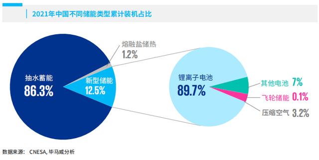 根據(jù)CNESA數(shù)據(jù),2021年中國儲能市場中不同類型儲能方式的占比與全球基本保持一致。其中抽水蓄能仍是最主要的儲能方式,占比86.3%,與全球86.2%的占比持平;但抽水蓄能電站的建設(shè)受地形因素限制較大,且建設(shè)周期較長,通常需要7年左右,未來隨著電化學(xué)儲能等新型儲能造價的下降,抽水蓄能在電力系統(tǒng)中的發(fā)展空間可能受限。新型儲能方式占比12.5%,高于全球0.3個百分點(diǎn)。電化學(xué)儲能為最主要的新型儲能方式,占比96.7%,比全球占比略低一個百分點(diǎn),鋰離子電池占據(jù)主流。