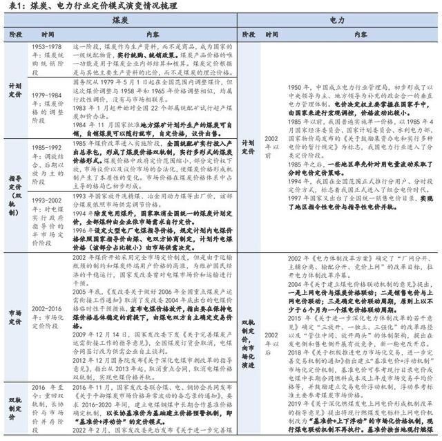 煤電矛盾的本質(zhì)是煤、電定價(jià)機(jī)制市場(chǎng)化程度不同。煤炭定價(jià)方面,2016 年以前我國(guó)煤炭?jī)r(jià)格經(jīng)歷了計(jì)劃價(jià)格、指導(dǎo)價(jià)格、市場(chǎng)價(jià)格等多種定價(jià)機(jī)制。2016 年末國(guó)家發(fā)改委聯(lián)合煤、電、鋼協(xié)會(huì)共同發(fā)布《關(guān)于平抑煤炭市場(chǎng)價(jià)格異常波動(dòng)的備忘錄的通知》,要求 2016-2020 年間,建立電煤鋼煤中長(zhǎng)期合作基準(zhǔn)價(jià)格確定機(jī)制,以長(zhǎng)協(xié)基準(zhǔn)價(jià)為基礎(chǔ)建立價(jià)格預(yù)警機(jī)制,即“基準(zhǔn)價(jià)+浮動(dòng)價(jià)”的定價(jià)模式。電力定價(jià)方面,2015 年國(guó)家開(kāi)啟電力定價(jià)機(jī)制市場(chǎng)化改革,2020 年取消“煤電聯(lián)動(dòng)”機(jī)制,同時(shí)將燃煤發(fā)電標(biāo)桿上網(wǎng)電價(jià)機(jī)制改為“基準(zhǔn)價(jià)+上下浮動(dòng)”的市場(chǎng)化價(jià)格機(jī)制,基準(zhǔn)價(jià)格設(shè)定權(quán)下放至地方政府,浮動(dòng)幅度由電力用戶(hù)等市場(chǎng)主體協(xié)商決定。