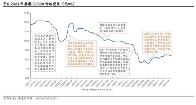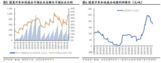 行業(yè)利潤(rùn)方面,受宏觀經(jīng)濟(jì)“弱復(fù)蘇”、煤炭供給寬松、各環(huán)節(jié)庫(kù)存高企等影響,市場(chǎng)煤價(jià)格下行較為明顯。據(jù)煤炭資源網(wǎng),截至 2023 年 7 月 14 日秦港動(dòng)力混煤 Q5500 價(jià)格較年初下跌幅度為 28.4%,煤價(jià)中樞約為 1009 元/噸。而煤炭開(kāi)采和洗選業(yè)在 2023 年 1-6 月實(shí)現(xiàn)利潤(rùn)總額4127.6 億元,同比減少 23.3%。與此同時(shí)行業(yè)噸煤利潤(rùn)為 179 元/噸,較去年同期減少 65 元/噸,較 2022 年底減少 48 元/噸,但整體均值仍遠(yuǎn)高于 2021 年以前。