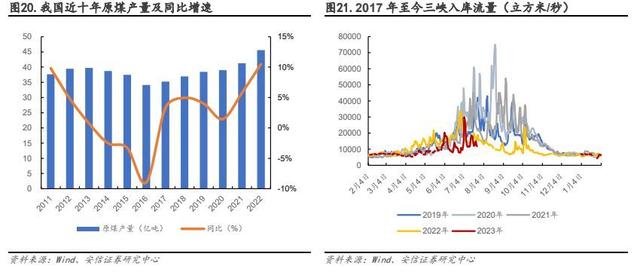 確保能源安全穩(wěn)定供應(yīng),煤電扛起保供重任。2023 年 4 月《2023 年能源工作指導(dǎo)意見(jiàn)》發(fā)布,不同于 2021 年指導(dǎo)意見(jiàn)中將“能源結(jié)構(gòu)”放在了目標(biāo)首位,國(guó)家能源局已經(jīng)連續(xù)兩年堅(jiān)持把“增強(qiáng)供應(yīng)保障能力”放在主要目標(biāo)首位。由此可見(jiàn),自 2021 年起頻發(fā)的缺電事件使人們意識(shí)到能源保供需求刻不容緩,而我國(guó)以煤為主的資源稟賦,決定了煤電在相當(dāng)長(zhǎng)時(shí)期內(nèi)仍將承擔(dān)保障我國(guó)能源安全的重要作用。從數(shù)據(jù)來(lái)看,煤炭方面,在能源保供要求下國(guó)家通過(guò)核增產(chǎn)能、擴(kuò)產(chǎn)、新投產(chǎn)等方式持續(xù)新增煤炭產(chǎn)能,據(jù)國(guó)家統(tǒng)計(jì)局,2022 年我國(guó)實(shí)現(xiàn)煤炭產(chǎn)量 45.6 億噸,同比增長(zhǎng) 10.5%,為近十年來(lái)最高增速。煤電方面,去年夏季以來(lái),降水偏枯造成水電發(fā)電量持續(xù)出力不足,2022 年下半年至 2023 年上半年三峽水庫(kù)日均流入量為近五年來(lái)同期低位,據(jù)國(guó)家統(tǒng)計(jì)局,2023 年 1-6 月我國(guó)水力發(fā)電量同比下降 22.9%。為彌補(bǔ)水力發(fā)電不足,2023 年 1-6 月我國(guó)火力絕對(duì)發(fā)電量達(dá)到 29457 億千瓦時(shí),同比增長(zhǎng) 7.5%,占上半年總發(fā)電量的 71%。