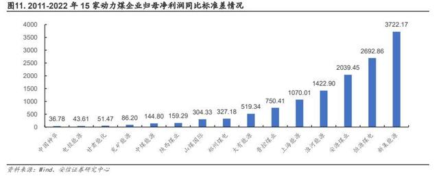 2)抵御周期方面,中國(guó)神華的煤電一體也一定程度熨平了煤、電行業(yè)周期波動(dòng),2011-2015年,受經(jīng)濟(jì)增長(zhǎng)動(dòng)能弱化、煤炭行業(yè)產(chǎn)能逐漸過(guò)剩影響,煤價(jià)整體波動(dòng)向下,同時(shí)期公司煤炭分部毛利率由 32%下降至 16%,而發(fā)電分部因成本改善毛利率由 24%上升至 36%。根據(jù)中國(guó)煤炭協(xié)會(huì)的統(tǒng)計(jì),2015 年煤炭行業(yè)虧損面已超過(guò)八成,而中國(guó)神華依舊實(shí)現(xiàn)歸母凈利潤(rùn)161.44 億元,凈利率 13.14%,位列當(dāng)年動(dòng)力煤(中信)板塊公司榜首。2021-2022 年在火電企業(yè)大幅虧損的局面下,公司發(fā)電分部憑借穩(wěn)定煤源依舊實(shí)現(xiàn)毛利率 7.7%和 14.3%。在此基礎(chǔ)上,中國(guó)神華的煤炭業(yè)務(wù)與發(fā)電業(yè)務(wù)形成良好對(duì)沖,一定程度加強(qiáng)了業(yè)績(jī)的穩(wěn)定性。我們選取 Wind 中主業(yè)為動(dòng)力煤的 15 家上市公司作為樣本,計(jì)算其 2011-2022 年歸母凈利潤(rùn)同比變動(dòng)標(biāo)準(zhǔn)差。結(jié)果顯示中國(guó)神華的同比變動(dòng)標(biāo)準(zhǔn)差最小,側(cè)面反映其盈利穩(wěn)定性。此外,據(jù)《煤電一體化深度融合發(fā)展的國(guó)神路徑研究》(2020)的分析,國(guó)家能源集團(tuán)旗下國(guó)神公司的煤電一體化項(xiàng)目除了通過(guò)傳統(tǒng)方式建設(shè)坑口電廠,減少煤炭流通環(huán)節(jié)實(shí)現(xiàn)內(nèi)部降本外,還通過(guò)水汽互補(bǔ)利用,燃料經(jīng)濟(jì)摻燒等創(chuàng)新方式降低生產(chǎn)成本,提高產(chǎn)業(yè)協(xié)同效應(yīng)。