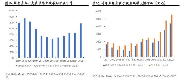 “雙碳”目標(biāo)下,煤企轉(zhuǎn)型具備先天產(chǎn)業(yè)優(yōu)勢(shì)、地域優(yōu)勢(shì)且資金充足。一方面,煤企具有產(chǎn)業(yè)優(yōu)勢(shì),具備能源開(kāi)采、裝備制造的成熟經(jīng)驗(yàn),擁有穩(wěn)定的下游電廠、化工客源,以及先天地域優(yōu)勢(shì)。我國(guó)大型新能源項(xiàng)目基地多數(shù)位于西北地區(qū),與煤炭資源分布重合度較高,如我國(guó)第一批容量約 1 億千瓦的大型風(fēng)電光伏基地主要位于甘肅、青海、內(nèi)蒙、寧夏等西部地區(qū)。此外,與傳統(tǒng)能源相比,新能源占地面積大。隨著新能源規(guī)??焖贁U(kuò)大,土地資源已經(jīng)成為影響新能源發(fā)展的重要因素,煤炭企業(yè)可利用自有采煤沉陷區(qū)受損土地規(guī)劃建設(shè)光伏發(fā)電、風(fēng)力發(fā)電等新能源項(xiàng)目,提高資源利用率的同時(shí)還可實(shí)現(xiàn)綠色轉(zhuǎn)型。另一方面,受制于 2011-2013 年行業(yè)產(chǎn)能過(guò)剩以及 2016 年以來(lái)的供給側(cè)結(jié)構(gòu)性改革,煤炭行業(yè)資本開(kāi)支明顯下降,2021 年至今雖在行業(yè)景氣度好轉(zhuǎn)以及政策鼓勵(lì)保供穩(wěn)價(jià)背景下有所回升,但在“雙碳”目標(biāo)持續(xù)推進(jìn)下,煤炭固定資產(chǎn)投資規(guī)模大、時(shí)間長(zhǎng),資本開(kāi)支仍低于此前水平,且新礦井的使用時(shí)間一般長(zhǎng)達(dá)數(shù)十年之久,長(zhǎng)期來(lái)看與雙碳背景相違背,企業(yè)進(jìn)行煤炭固定資產(chǎn)投資的意愿不強(qiáng)。但近兩年煤價(jià)高位運(yùn)行,使得煤炭企業(yè)盈利能力持續(xù)改善,在手現(xiàn)金規(guī)模大幅增加,為后續(xù)轉(zhuǎn)型提供基礎(chǔ)。
