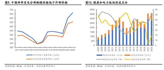平抑周期波動(dòng)、協(xié)同上下游降本,煤電一體強(qiáng)化業(yè)績(jī)穩(wěn)定性。煤電聯(lián)營(yíng)可以使煤企和電企建立一種互補(bǔ)的、長(zhǎng)效的利益共享、風(fēng)險(xiǎn)共擔(dān)的機(jī)制,降低因?yàn)槊簝r(jià)波動(dòng)帶來(lái)的經(jīng)營(yíng)風(fēng)險(xiǎn),確保電廠燃料長(zhǎng)期穩(wěn)定供應(yīng)的同時(shí)還可減少中間采購(gòu)環(huán)節(jié),大幅降低發(fā)電成本并鎖定下游火電利潤(rùn)。以中國(guó)神華為例:1)內(nèi)部降本方面,據(jù)公司年報(bào),2011 年至今中國(guó)神華發(fā)電分部80%以上煤炭源于內(nèi)部采購(gòu),且采購(gòu)價(jià)格均低于外部銷(xiāo)售價(jià)格,最大限度降低電廠用煤成本。