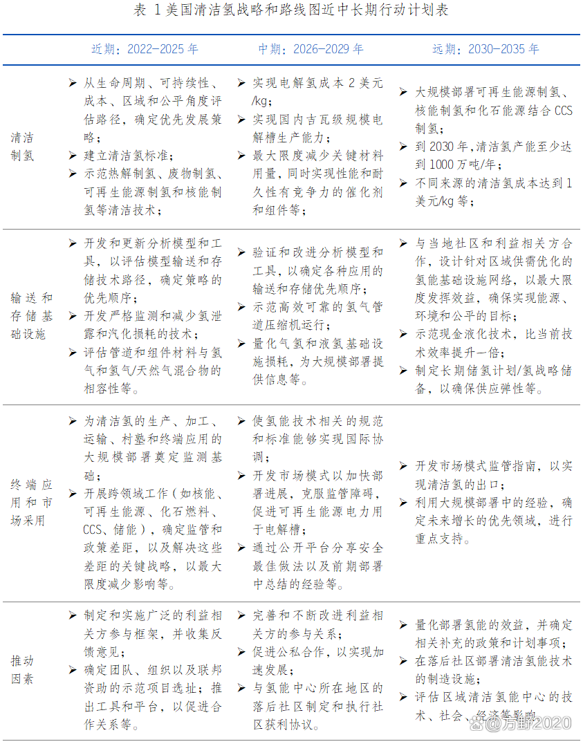 美國是最早發(fā)展氫能的國家,多年來始終將氫能作為重要能源戰(zhàn)略儲(chǔ)備技術(shù),持續(xù)支持氫能全產(chǎn)業(yè)鏈技術(shù)研發(fā),并加快示范創(chuàng)建和戰(zhàn)略部署,以期實(shí)氫能產(chǎn)業(yè)規(guī)?;l(fā)展。2021年7月美國能源部(以下簡稱“DOE”)宣布投資5250萬美元用于綠氫技術(shù)的研發(fā),這筆資金將惠及多項(xiàng)氫能研發(fā)項(xiàng)目,旨在十年內(nèi)將氫能成本降低80%,達(dá)到每千克1美元。11月DOE又發(fā)布《碳中性氫能技術(shù)基礎(chǔ)科學(xué)》研發(fā)指南,明確了高效新型電解水制氫、氫機(jī)理等4個(gè)優(yōu)先研發(fā)方向。2022年2月,DOE下屬化石能源和碳管理辦公室宣布2800萬美元的聯(lián)邦資金,用于推動(dòng)綠氫作為一種無碳燃料用于交通、工業(yè)和電力生產(chǎn)。2022年11月,DOE發(fā)布《國家清潔氫能戰(zhàn)略和路線圖(草案)》,制定2022-2035年近、中、長期清潔氫能發(fā)展行動(dòng)時(shí)間表,如表1所示,明確在制氫、儲(chǔ)氫、運(yùn)氫及終端應(yīng)用的各階段發(fā)展目標(biāo)。此外,美國于2023年6月發(fā)布首個(gè)國家能源戰(zhàn)略規(guī)劃路線圖。