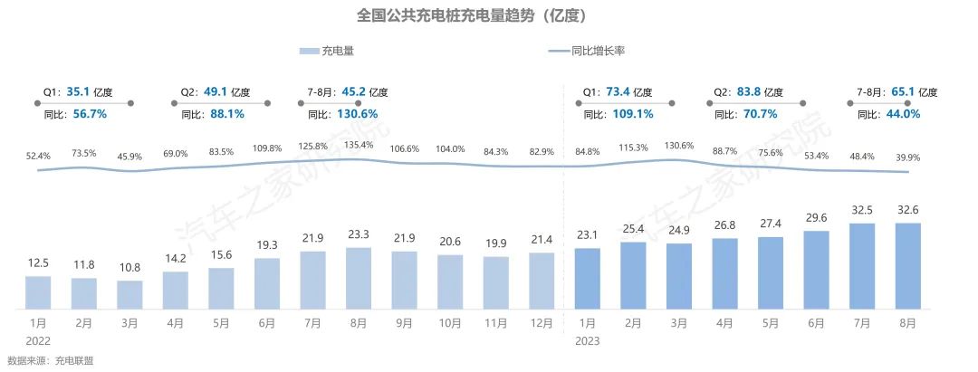 從公樁使用情況上看,隨著新能源汽車保有量的快速增長(zhǎng),公樁充電量持續(xù)增長(zhǎng),今年1-8月充電量已超過去年全年充電量之和。今年新能源汽車銷量持續(xù)高漲,滲透率不斷提高,隨之帶來的是新能源用車出行需求快速增長(zhǎng),使得全國(guó)公共充電樁充電量在7、8兩個(gè)月內(nèi)連續(xù)超越30億度大關(guān)。