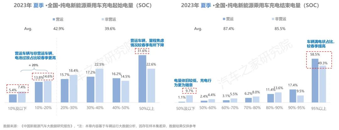 從充電開始電量上看,在夏季營(yíng)運(yùn)與非營(yíng)運(yùn)車輛均有相當(dāng)比例的車輛存在電池過放有害電池健康的現(xiàn)象,這一情況的比例較春季明顯增加。同時(shí),在剩余電量在50%以上就開始充電的車主數(shù)量較春季有明顯下降,營(yíng)運(yùn)車輛與家用車輛車主對(duì)里程焦慮感有所減弱。