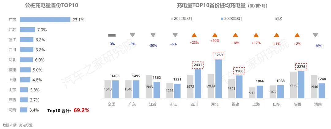 從各省份充電量上看,廣東省擁有全國(guó)22%的公共樁,充了全國(guó)23.1%的電量,在充電量方面同樣成為當(dāng)之無愧的王者。