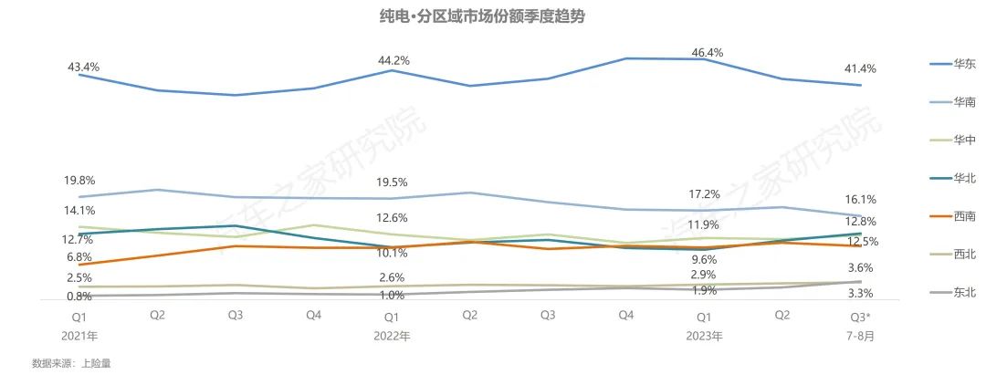 從區(qū)域角度上看,以長(zhǎng)三角為代表的華東地區(qū)是中國(guó)發(fā)展的重要引擎,匯聚多個(gè)經(jīng)濟(jì)發(fā)達(dá)的省、市,更高的本地居民收入與完善的充電基礎(chǔ)設(shè)施配套,促使當(dāng)?shù)叵M(fèi)者對(duì)新能源純電汽車更加旺盛的購(gòu)車需求,其市場(chǎng)份額長(zhǎng)期保持在40%以上,成為新能源純電車型最為重要的區(qū)域市場(chǎng);華南地區(qū)以16%左右的份額位居第二;華中、華北、西南市場(chǎng)占比均在12%左右,份額十分相近;西北、東北市場(chǎng)占比尚不足5%。