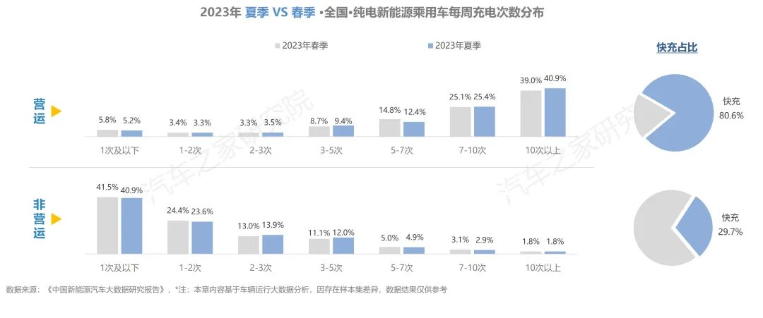 純電營(yíng)運(yùn)車輛每周充電超過7次的占比超過60%,且在所有的補(bǔ)能行為中,使用快充的占比高達(dá)80%。非營(yíng)運(yùn)車輛中超四成的車輛,每周僅充電1次,選擇快充方式補(bǔ)能的占比不足30%。