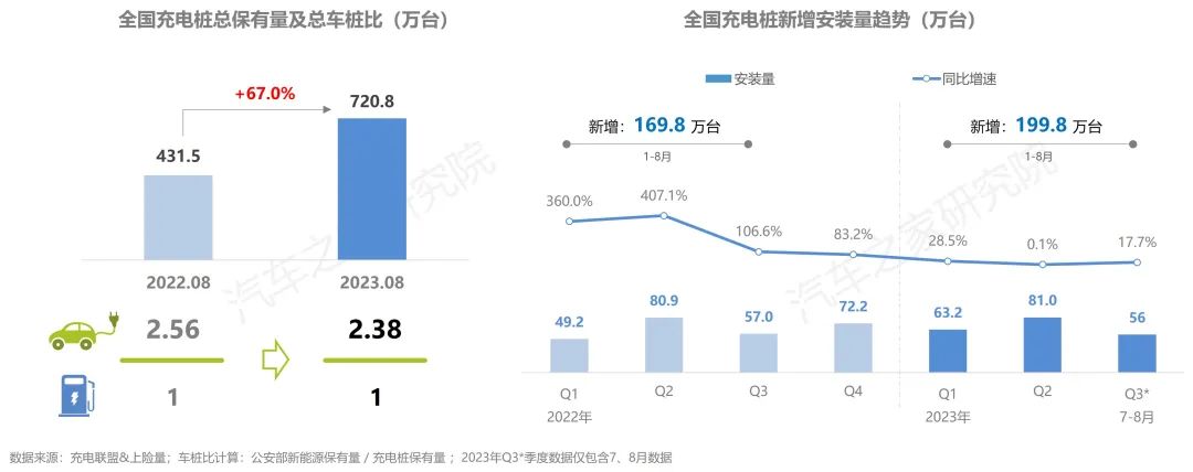 截止2023年8月,全國(guó)充電基礎(chǔ)設(shè)施累計(jì)數(shù)量為720萬臺(tái),同比增加67.0%,車樁比為2.38,較去年同期與今年二季度的2.43均繼續(xù)下降。從充電設(shè)施建設(shè)上看,今年1-8月,充電樁新增安裝近200萬臺(tái),新增安裝數(shù)量超越去年同期,7-8月充電樁安裝56萬臺(tái),與今年二季度相比增速再次抬頭。