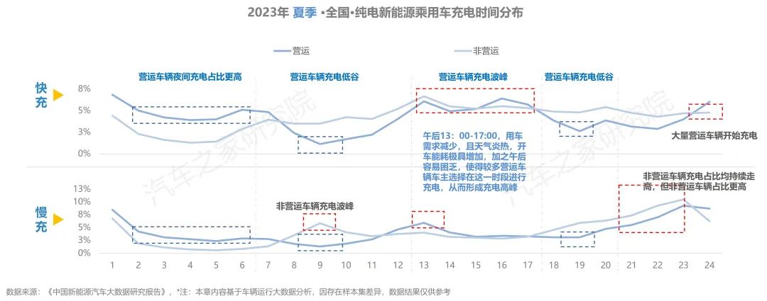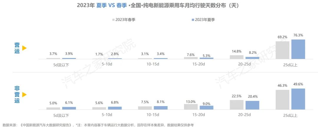 與去年同期相比,純電車輛在行駛里程有所增加,在出行天數(shù)與行駛時(shí)長(zhǎng)方面,同去年夏季相比大體持平。而從不同車輛性質(zhì)對(duì)比上看,營(yíng)運(yùn)車輛的使用強(qiáng)度遠(yuǎn)超非營(yíng)運(yùn)車輛,兩者在行駛里程方面相差超6倍,在日均時(shí)長(zhǎng)則亦有近5倍的差距。