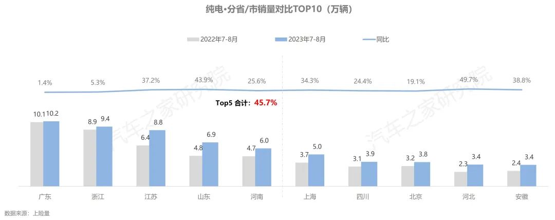 從省份角度看,在排名前五的省份中,廣東省是唯一銷量超過10萬輛的省份,繼續(xù)占據(jù)首位,排名第二至第五名的浙江、江蘇、山東、河南,五省合計(jì)占近50%的全國(guó)市場(chǎng)份額。排名前10的省份中,山東、河北省的市場(chǎng)成長(zhǎng)性最為優(yōu)異,今年7-8月銷量同比增速近50%。