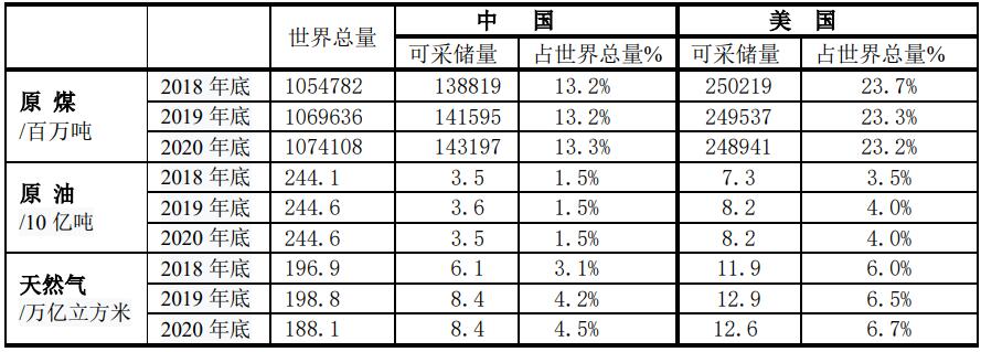 當(dāng)今能源消費(fèi)仍然以化石燃料為主。此表來自BP 2019~2021年報(bào)告的數(shù)據(jù)匯總而成,很明顯地看出,中國化石燃料的可采儲量遠(yuǎn)低于美國,因此支撐中國經(jīng)濟(jì)發(fā)展的原煤、原油和天然氣均需大量進(jìn)口。