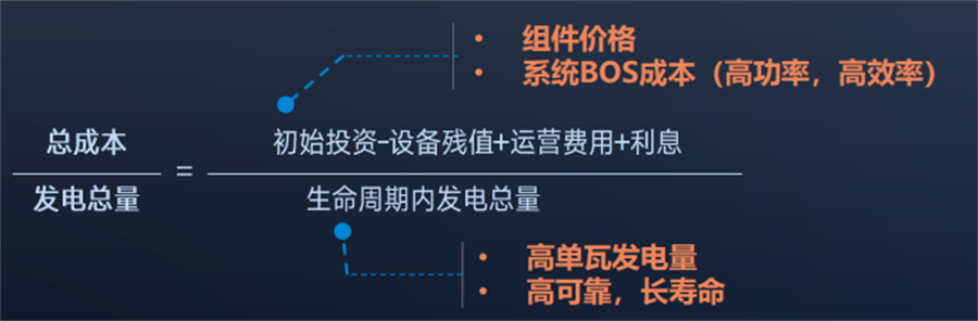 因此,高功率、高效率產(chǎn)品可以降低系統(tǒng)BOS成本,減少項目初始投資,減少分子;高發(fā)電量、高可靠性組件產(chǎn)品可以增加電站項目全生命周期的發(fā)電總量,使分母變大。