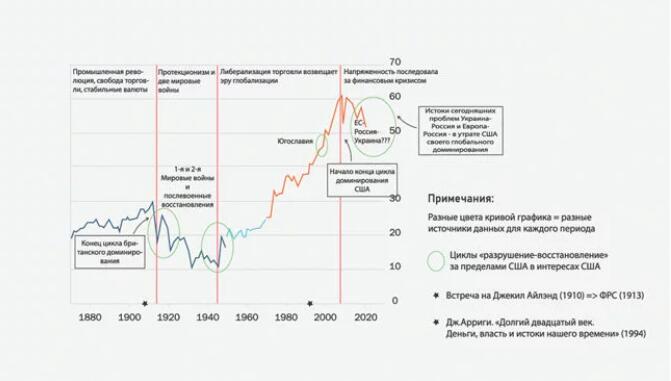 20世紀(jì)美國的兩次崛起可視為其積累周期、“漫長世紀(jì)”的基礎(chǔ)。這兩次崛起基于兩次世界大戰(zhàn)及其戰(zhàn)后恢復(fù)期,這里值得注意的是,兩次大戰(zhàn)均發(fā)生于歐洲和亞洲,不在美國的領(lǐng)土之上。很大程度上,美國為這兩次在其領(lǐng)土之外進(jìn)行的戰(zhàn)爭和戰(zhàn)后重建提供了物資和技術(shù)(在擴(kuò)展自己產(chǎn)量的基礎(chǔ)上)。另一方面,在美聯(lián)儲的運(yùn)作下世界經(jīng)濟(jì)美元化的程度不斷加深??梢哉f,美國“漫長世紀(jì)”基于其疆域以外的世界經(jīng)歷“破壞—重建”,循環(huán)往復(fù)。