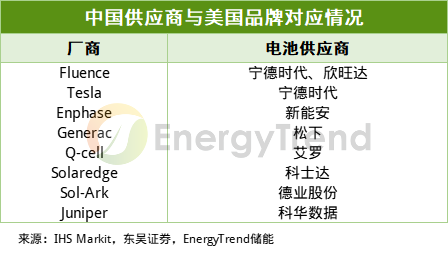 美國戶儲以本土品牌為主,中國供應(yīng)商占比逐步提升。2021年美國戶用市場中,Tesla、BYD、Enphase分列前三,國內(nèi)產(chǎn)業(yè)鏈占比提升。特斯拉采用寧德100ah的方形電池;Enphase采用新能安52ah的軟包電池。