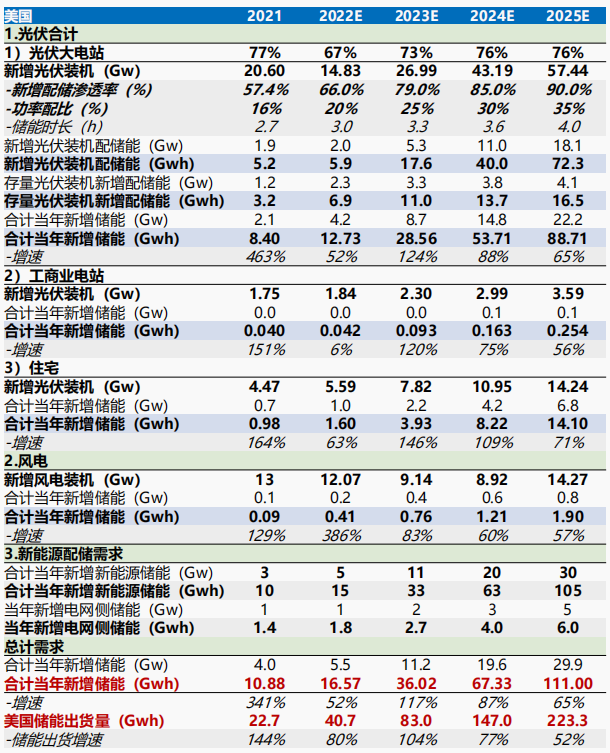 隨著多地儲能政策不斷出臺及市場機制日益完善,美國工商業(yè)儲能市場將逐步增長。綜上,預(yù)計2023年美國儲能市場總需求為36GWh,對應(yīng)出貨量為83GWh,裝機/出貨同增117%/104%,到2025年裝機/出貨需求為111GWh/223GWh,2022-2025年裝機/出貨CAGR分別為88.5%/76.4%。
