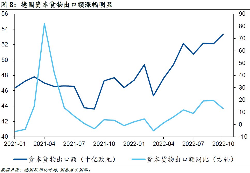 更加重要的是,為了應(yīng)對(duì)中長(zhǎng)期能源危機(jī),歐盟各國(guó)也開(kāi)始加大對(duì)制造業(yè)的支持力度,制定了“能源系統(tǒng)數(shù)字化”計(jì)劃,該計(jì)劃預(yù)期在2030年前在基礎(chǔ)設(shè)施方面投資5,650億歐元,以大力發(fā)展光伏和新能源汽車(chē)產(chǎn)業(yè);除此以外,歐盟還加大了對(duì)液化天然氣產(chǎn)業(yè)的投資力度。德國(guó)作為歐洲經(jīng)濟(jì)的最重要組成部門(mén),受益于政策支持,其工業(yè)生產(chǎn)并沒(méi)有受到太多能源問(wèn)題的干擾,尤其是核心的資本貨物出口額在衰退預(yù)期的背景下持續(xù)增長(zhǎng)。