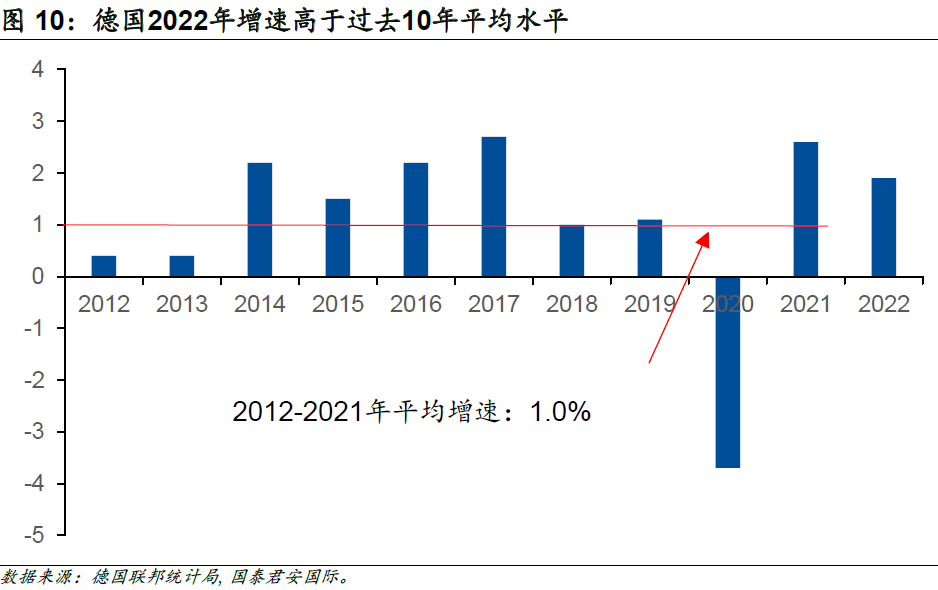 作為歐元區(qū)最大的經(jīng)濟(jì)體,近日公布的數(shù)據(jù)顯示,經(jīng)過(guò)價(jià)格調(diào)整后,德國(guó)2022年GDP同比增長(zhǎng)1.9%,高于市場(chǎng)預(yù)期1.8%。不可否認(rèn)的是,俄烏沖突推升的天然氣價(jià)格給德國(guó)經(jīng)濟(jì)造成了相當(dāng)大的困擾,但是德國(guó)2022年GDP依舊增長(zhǎng)1.9%,較2019年(新冠疫情開(kāi)始前一年)高0.7個(gè)百分點(diǎn),亦高于2012年至2021年的十年平均水平(1.0%)。