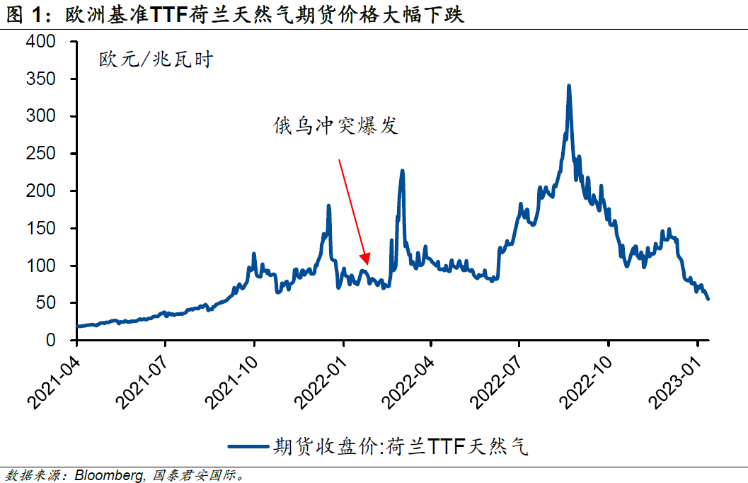 暖冬的到來(lái)極大程度上縮減了供熱對(duì)天然氣的需求,歐洲基準(zhǔn)TTF荷蘭天然氣期貨價(jià)格延續(xù)了之前的大幅回落趨勢(shì)。截至2023年1月中旬,期貨價(jià)格已經(jīng)低于俄烏沖突爆發(fā)前的水平。在天然氣價(jià)格走低的情況下,能源價(jià)格不應(yīng)該繼續(xù)推動(dòng)通脹高企;另一方面,隨著中國(guó)2023年經(jīng)濟(jì)預(yù)期的大幅上修,歐元區(qū)出口有望迎來(lái)顯著改善。歐洲2023年的衰退預(yù)期似乎也應(yīng)該畫(huà)上一個(gè)問(wèn)號(hào)?
