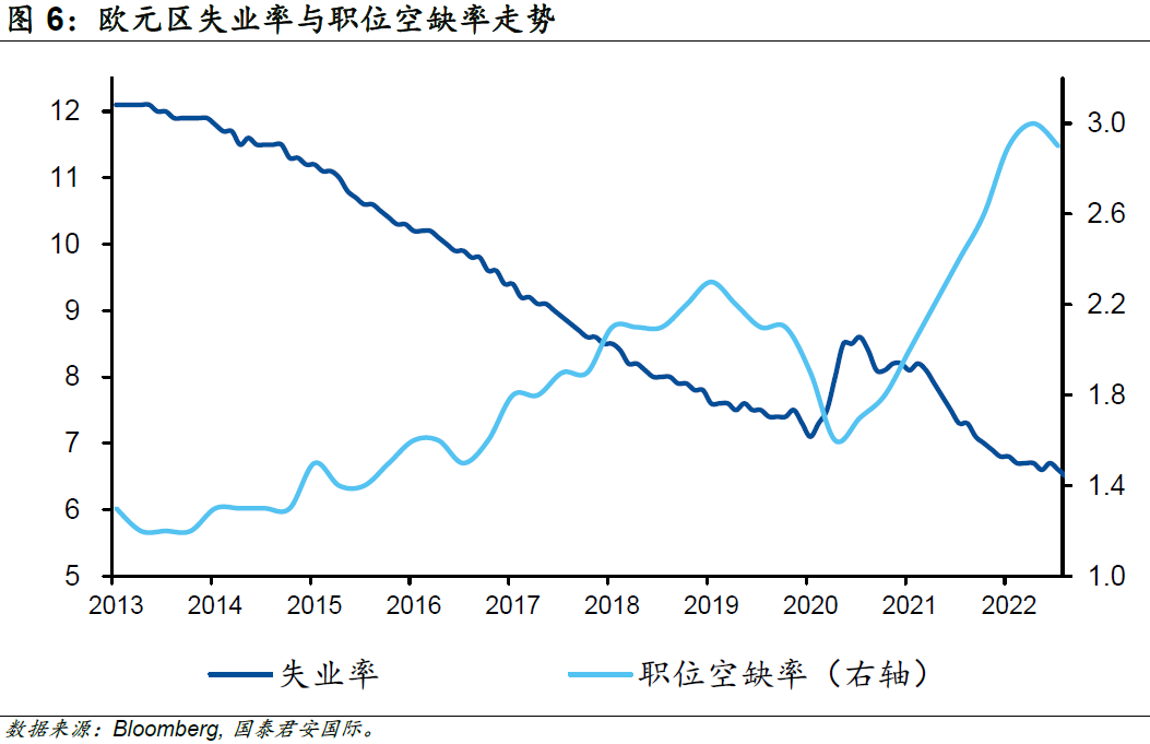 如果說(shuō)天氣在很大程度上幫助了歐洲人,但歐洲經(jīng)濟(jì)超預(yù)期的根本原因大概率不是因?yàn)樾疫\(yùn)或者天氣。進(jìn)一步來(lái)看,勞動(dòng)力市場(chǎng)的火熱意味著經(jīng)濟(jì)維持著較好的動(dòng)能。一方面,即使在能源價(jià)格高企的去年上半年,職位空缺率都處于上行趨勢(shì)中;另一方面,在緊張的企業(yè)用工環(huán)境中,歐元區(qū)的失業(yè)率開(kāi)始走低,并迭創(chuàng)歷史低點(diǎn)。在之前通脹大幅高走的背景下,歐元區(qū)多個(gè)國(guó)家的工會(huì)已經(jīng)通過(guò)罷工的形式確定了未來(lái)的漲薪方案。與此同時(shí),歐洲央行(ECB)基于通脹補(bǔ)償?shù)目紤],在2022年12月的最新預(yù)測(cè)中將2022-2024年的累積工資增長(zhǎng)較2022年9月的預(yù)測(cè)值上調(diào)1.4個(gè)百分點(diǎn)。