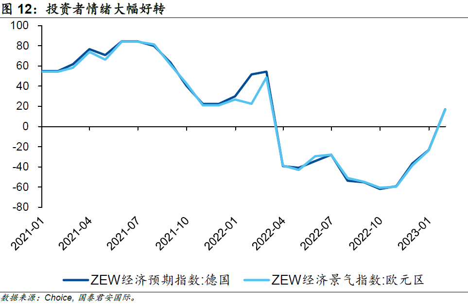 往前看,反映歐元區(qū)及德國(guó)投資者情緒的指標(biāo)“ZEW經(jīng)濟(jì)景氣指數(shù)”大幅好轉(zhuǎn)。在能源問(wèn)題好轉(zhuǎn)、中國(guó)經(jīng)濟(jì)向好的背景下,能源密集型企業(yè)及出口型企業(yè)的盈利預(yù)期也開(kāi)始上修,2023年1月德國(guó)ZEW經(jīng)濟(jì)景氣指數(shù)錄得16.9,遠(yuǎn)超預(yù)期值-15及前值-23.3。