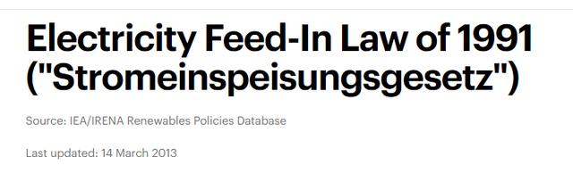 在此之前的1991年,德國已經(jīng)通過了《上網(wǎng)電價法(Stromeinspeisungsgesetz)》,推行可再生能源的補貼計劃。