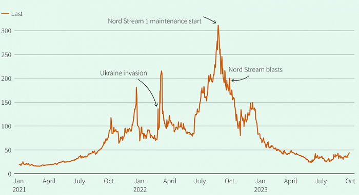 上圖顯示,歐洲天然氣價(jià)格在經(jīng)歷俄烏沖突、北溪檢修、北溪爆炸等不同階段之后,已有半年時(shí)間徘徊在50歐元/兆瓦時(shí)的下方,不到高點(diǎn)的六分之一,接近2021年水平。