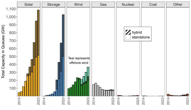 根據(jù)該報(bào)告,美國(guó)各地新能源發(fā)電和儲(chǔ)能項(xiàng)目的積壓?jiǎn)栴}進(jìn)一步加劇。截至2023年底,有近2600GW的發(fā)電和儲(chǔ)能容量正在尋求接入電網(wǎng),是現(xiàn)有美國(guó)電廠裝機(jī)總量的兩倍有余,其中超過95%容量來自于清潔能源項(xiàng)目。