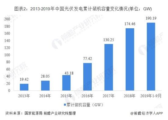 累計裝機容量方面,據(jù)國家能源局統(tǒng)計數(shù)據(jù)顯示,2013年以來,我國光伏發(fā)電累計裝機容量增長迅速。2013年,全國光伏發(fā)電累計裝機容量僅為19.42GW,到2018年已經(jīng)增長至174.46GW。預(yù)計2013-2019年,全國光伏發(fā)電累計裝機容量將有近10倍增長。截至2019年9月底,全國光伏發(fā)電累計裝機190.19GW,同比增長15%。