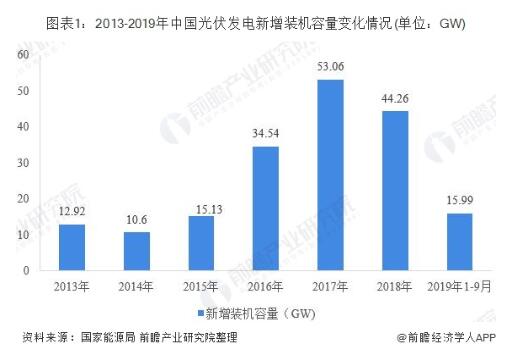 我國太陽能光伏行業(yè)雖起步較晚,但發(fā)展迅速,尤其是2013年以來,在國家及各地區(qū)的政策驅(qū)動下,太陽能光伏發(fā)電在我國呈現(xiàn)爆發(fā)式增長,據(jù)國家能源局統(tǒng)計數(shù)據(jù)顯示,2017年,我國光伏發(fā)電新增裝機容量為53.06GW,創(chuàng)歷史新高,2018年,受光伏531新政影響,各地光伏發(fā)電新增項目有所下滑,全年新增裝機容量為44.26GW,同比下降16.6%。截至2019年9月底,全國光伏發(fā)電新增裝機15.99GW。