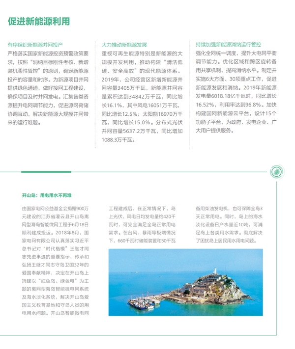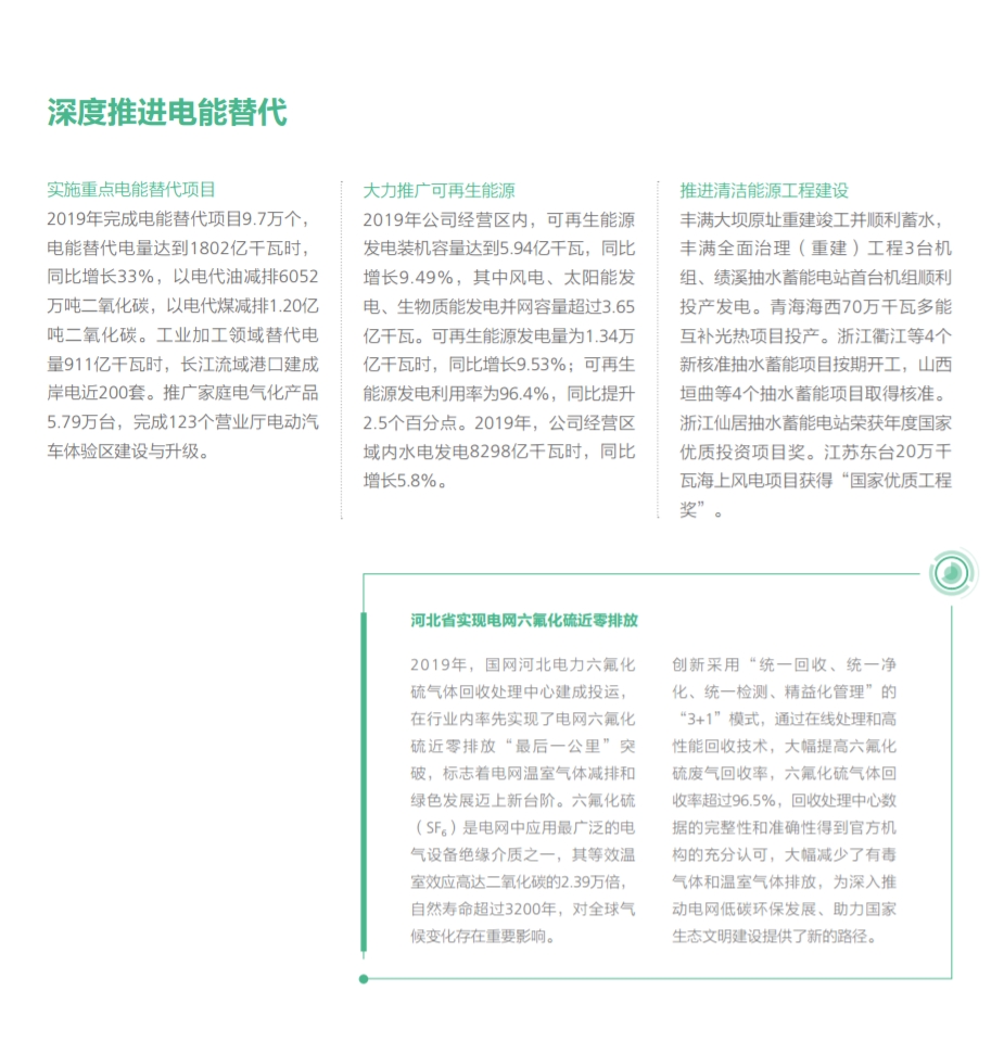 在努力做綠色發(fā)展的表率方面,國家電網(wǎng)有限公司認(rèn)真貫徹落實(shí)綠色發(fā)展理念,全力推進(jìn)生態(tài)文明建設(shè),推動能源更高質(zhì)量、更可持續(xù)發(fā)展,以綠色低碳高效的充足電能,全力服務(wù)美麗中國建設(shè)。2019年經(jīng)營區(qū)新增新能源并網(wǎng)容量3405萬千瓦,新能源并網(wǎng)容量累積達(dá)到34842萬千瓦,同比增長16.1%,新能源云平臺接入新能源場站55萬余座、裝機(jī)容量2.3億千瓦,累計(jì)交易額754.3億元,帶動產(chǎn)業(yè)鏈上下游3000余家企業(yè)協(xié)同發(fā)展;完成電能替代項(xiàng)目9.7萬個(gè),電能替代電量達(dá)到1802億千萬時(shí),“煤改電”配套電網(wǎng)建設(shè)惠及19684個(gè)村、372萬戶居民,以電代油減排二氧化碳6052萬噸,以電代煤減排二氧化碳1.20億噸;智慧車聯(lián)網(wǎng)平臺累計(jì)接入充電樁43萬個(gè),充電量達(dá)14.82 億千瓦時(shí),同比增長73.86%。