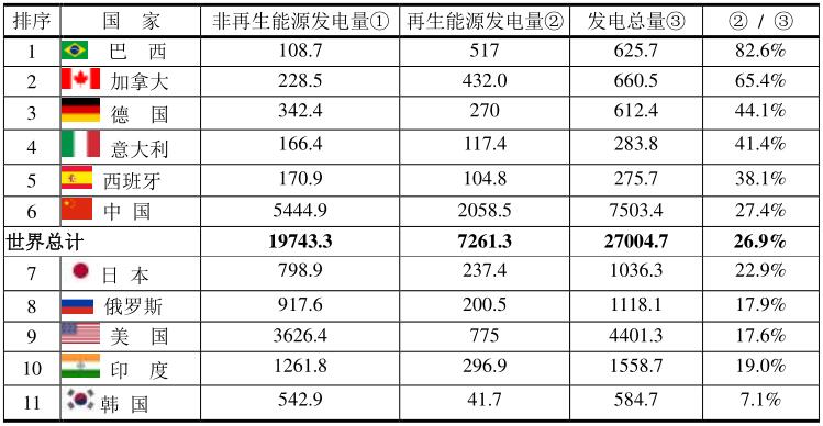 2019年主要國家再生能源發(fā)電的比例(單位:TWh)