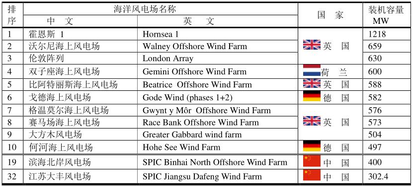 海洋最大的風(fēng)電場(chǎng)在英國(guó)倫敦陣列。中國(guó)最大的海上風(fēng)電場(chǎng)是濱海北岸風(fēng)電場(chǎng)(SPIC Binhai North Offshore Wind Farm),世界排序19,裝機(jī)容量400MW。SPIC是State Power Investment Corporation(國(guó)家電力投資公司)的縮寫(xiě)。